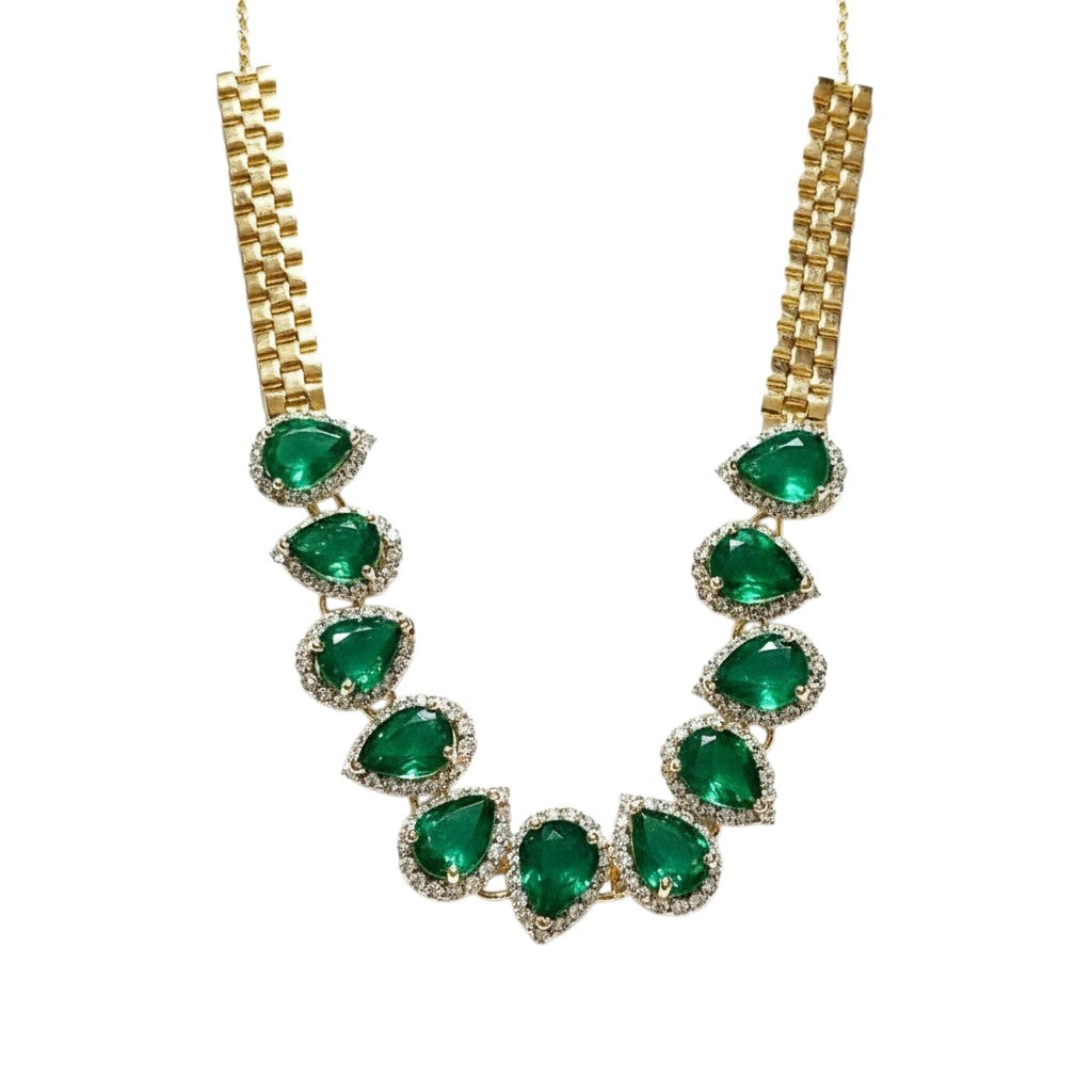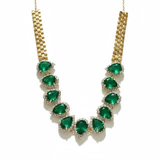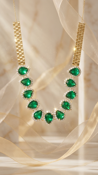 The Contrast: Nestled within this sea of diamonds are 2.80 carats of vivid Zambian Emeralds. Cut into elegant pear shapes, these emeralds offer a lush, "forest-green" transparency that is the signature of the Zambian mines. The combination of the icy white diamonds and the deep, transparent green creates a visual "Zenith"—the peak of gemstone elegance.