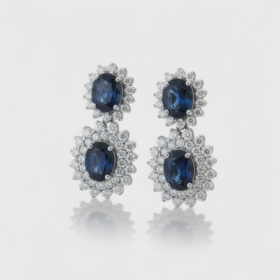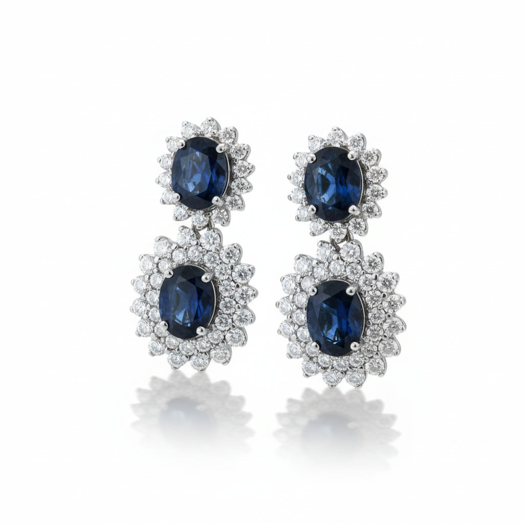 A bold expression of heritage and brilliance, these double-drop earrings feature richly saturated 7 carats of Burmese sapphire, celebrated for their deep royal-blue tone and exceptional vibrancy. Each oval sapphire is framed in a luminous halo of round brilliant diamonds, with a second diamond cluster below creating dramatic movement and layered sparkle.